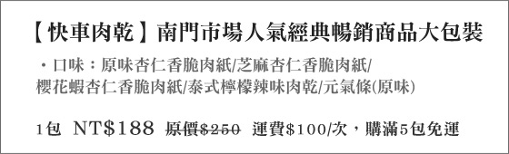 順便附上宅配年終大優惠!南門巿場名店快車肉乾,嚴選多款人氣產品,鎮店之寶薄脆肉紙,超值大包裝,現在入手最划算的網址:http://buyforfun.biz/redirect.php?k=43de122e419bb34fb9177c1193035e69&uid1=&uid2=&uid3=&uid4=&uid5=